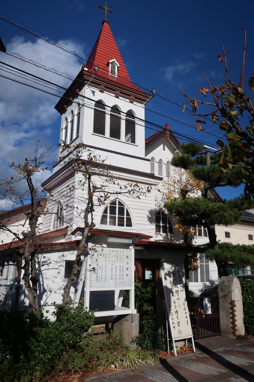 上田市役所の近くににあるプロテスタント教会の教会です。上田城に行く途中、白い壁に赤いとんがり帽子の木造に教会が可愛らしく見入ってしまいました。戦前の昭和10年に建てられてたゴシック様式の教会で今現在も現役で使われている所が良い所です。上田市内にはこの様な戦前の建物の出会えるのが散策していて楽しい所です。