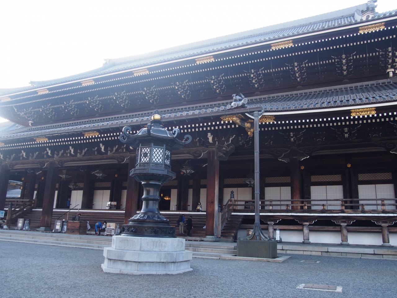 東本願寺の御影堂門をくぐり歩くとすぐ目の前にあるのが御影堂です。非常に大きな伽藍、建物で、世界最大級の木造建築物だそうで、なるほど思わせる大きさです。内部の見学は許されていませんが、靴を脱いで、廊下、通路などを歩いていけるので、その際に一部中は見ることはできます。