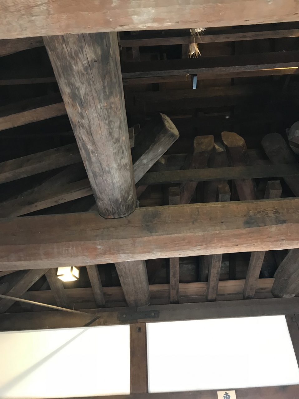 松本城の天守は6階が最上階で、ここは戦の時に周りの敵の様子を見るところとして使われておりました。天井は井桁ばりでがっちりと頑丈に組まれております。天井中央にまつられているのが、二十六夜神と言う松本城を守る神様です。