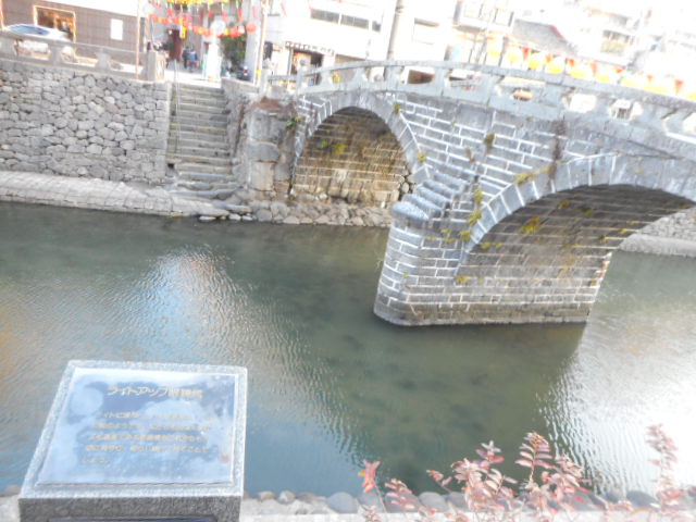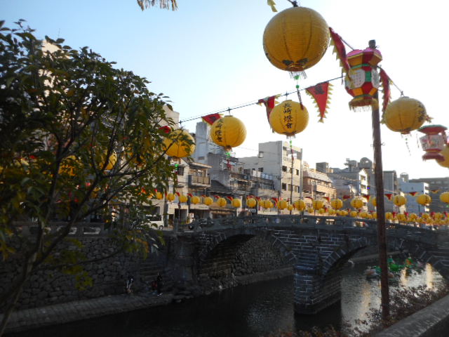 長崎の有名な観光名所です。石造りの橋で、水面に影が映ると、眼鏡のように見えます。観光客は多く写真スポットです。ハート形の石とかも近くにあります。ランタン祭り中だったので、川の上に黄色いランタンが一面にありました。川の周辺にも動物なランタンとかがありました。