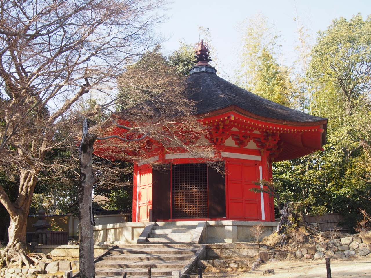 東福寺の通天橋を渡り左側の庭に降りて行くとあるお堂です。よく目立つ朱色の八角形の建物で、愛染明王を祀ったお堂ということです。訪れた2月の冬の時期は木々の葉もなく、寂しい木々の間に一段と朱色のお堂が目立っていました。中は見学できず、外観の見学だけになります。