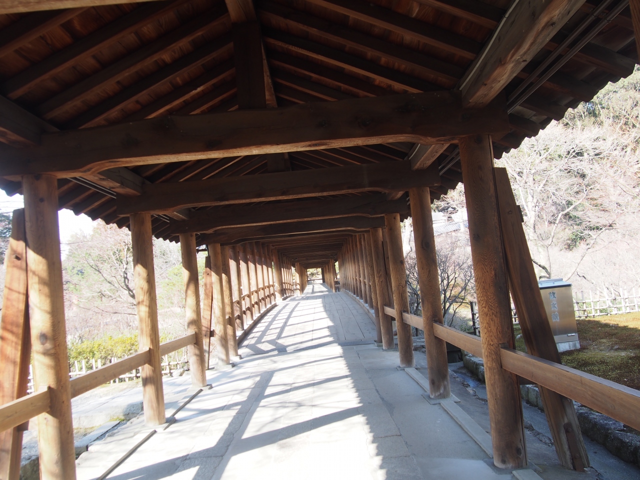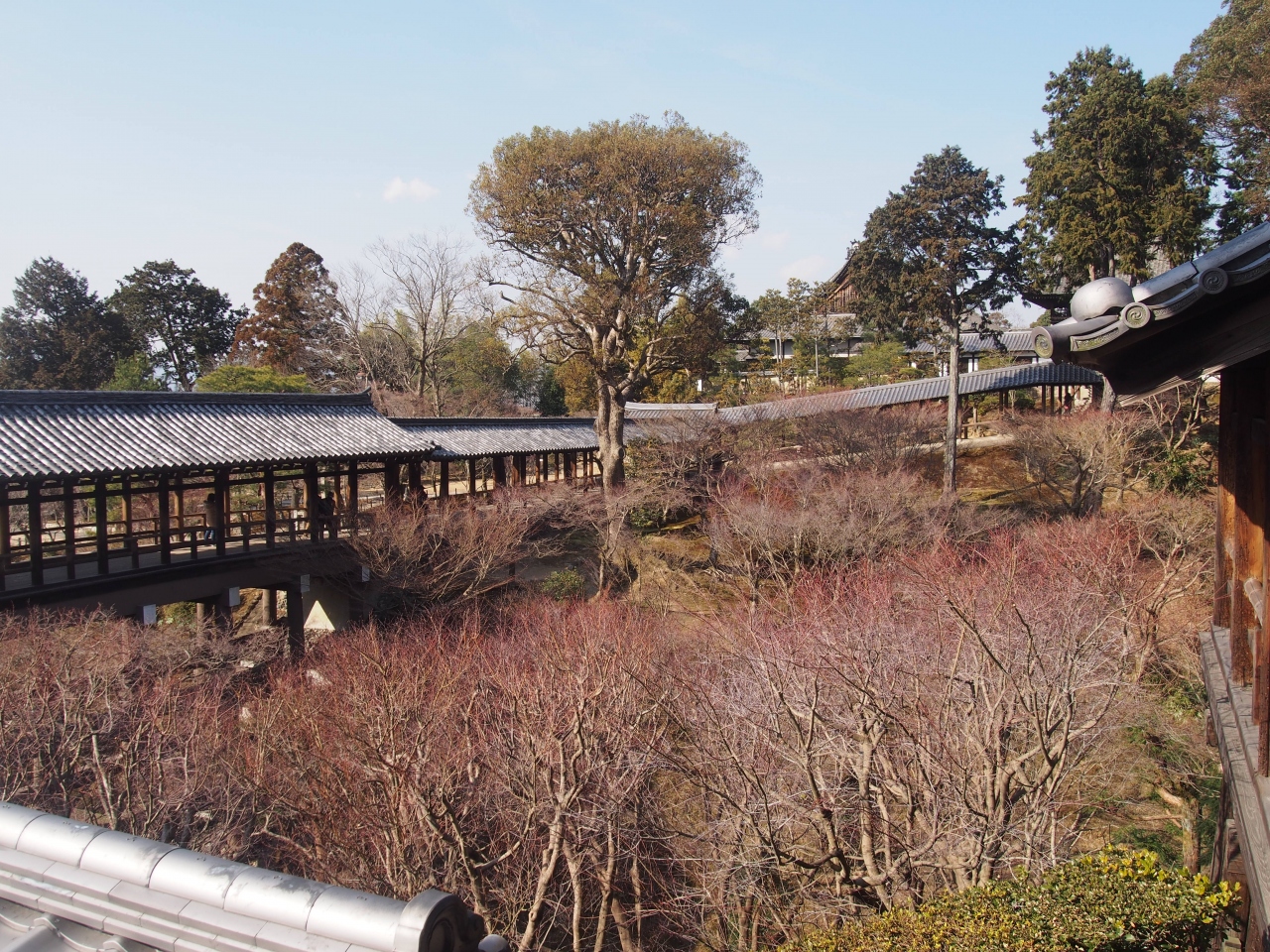 紅東福寺の通天橋は紅葉の有名スポットで、よくその美しい紅葉や混雑具合などがテレビなどで放送されていますが、訪れた2月は桜の花もなく、紅葉もないためか、ほとんど人も見かけず、ゆったりと歩いて観光できました。空いている時期もいいです。建物間の移動に造られた橋がこのような観光スポットになっているのは、昔の人も想像できなかったでしょう。