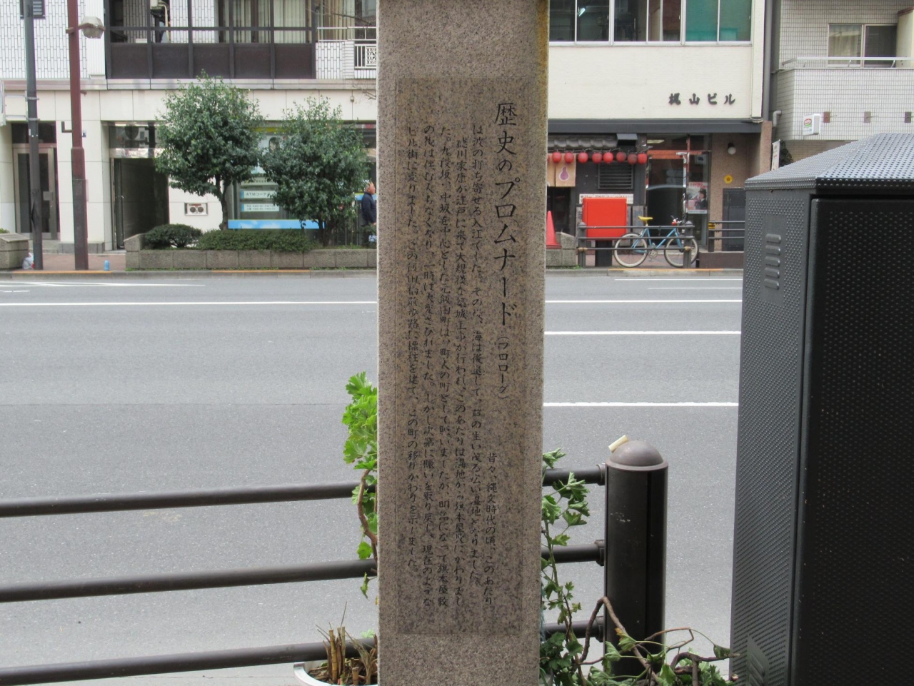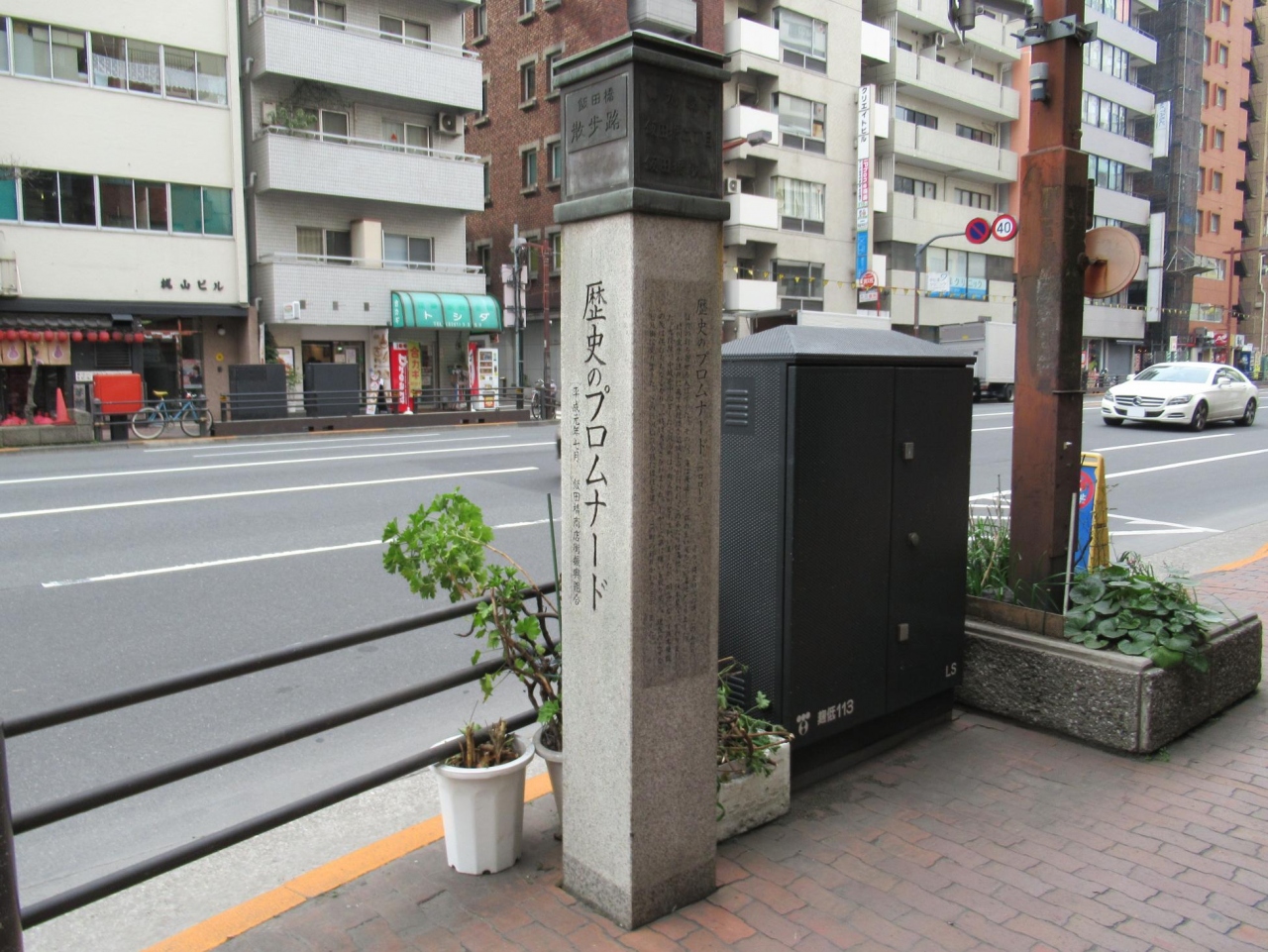 その一つがここ「歴史のプロムナード」で、JR飯田橋駅と九段下交差点の丁度中間辺りの東側歩道の車道側に標柱が建ててあります。