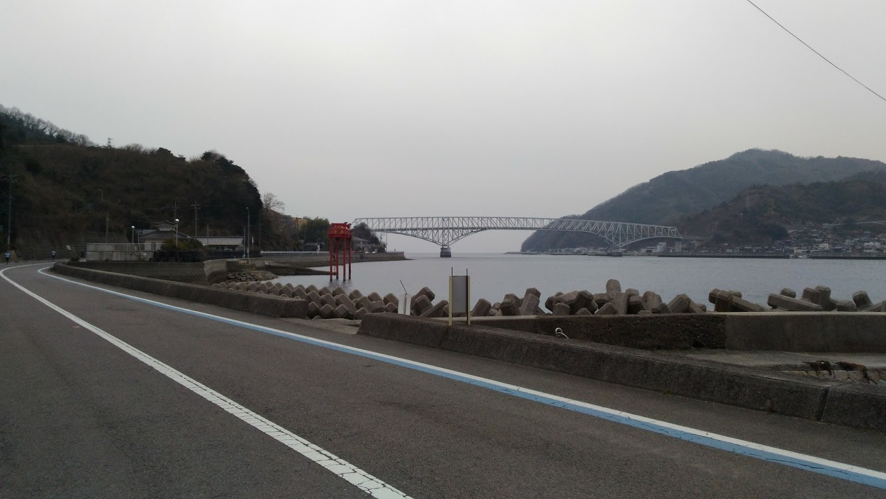 豊島と大崎下島を結ぶトラス橋。隣の島の豊島大橋ほどの高さはないが、それでも海岸線から上がる高さはある。豊島の豊浜の街がよく見える。しまなみ海道と違って、とびしま海道の橋は自転車でものんびり走れ、景色を楽しめるのがよい。