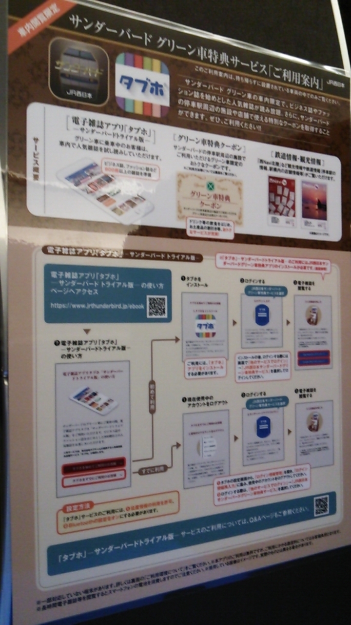 2017年12月30日に大阪16時42分発特急サンダーバード33号金沢行きのグリーン車で、新大阪から金沢まで利用したのですが、2017年12月30日現在、グリーン車利用者に対し、新たなグリーン特典サービスが実施されていました。