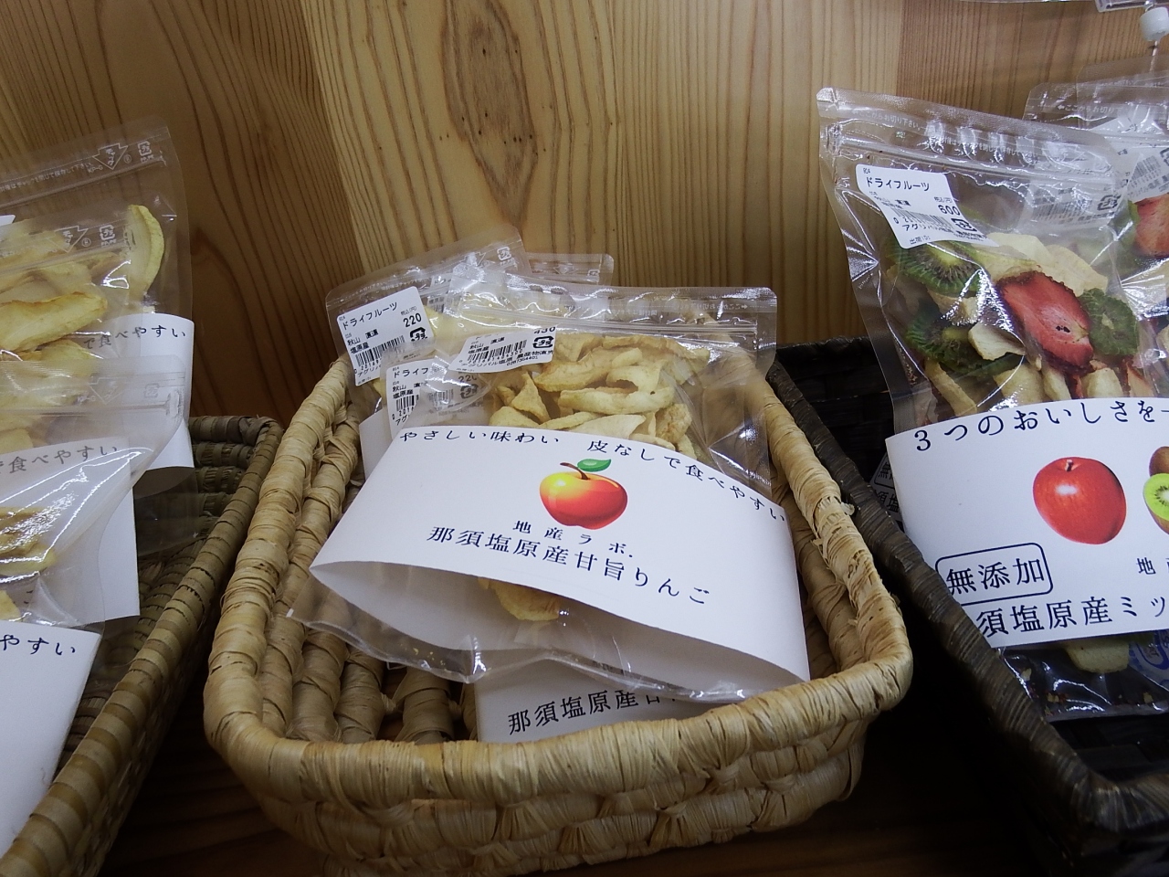 塩原産の農産物や、塩原産の果物を用いたジュースやドライフルーツを購入することができます。