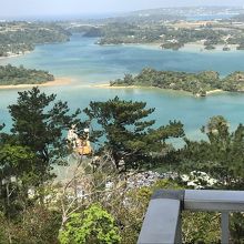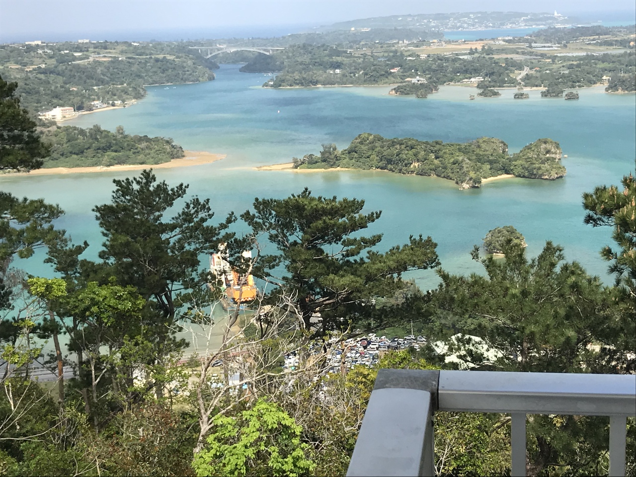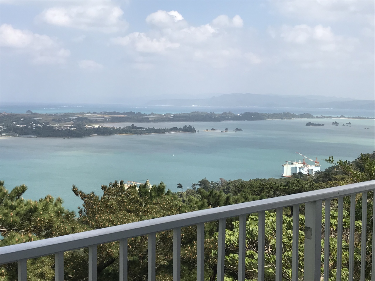 2階からは羽地内海を挟んで手前に屋我地島、その奥に古宇利島が見えます。