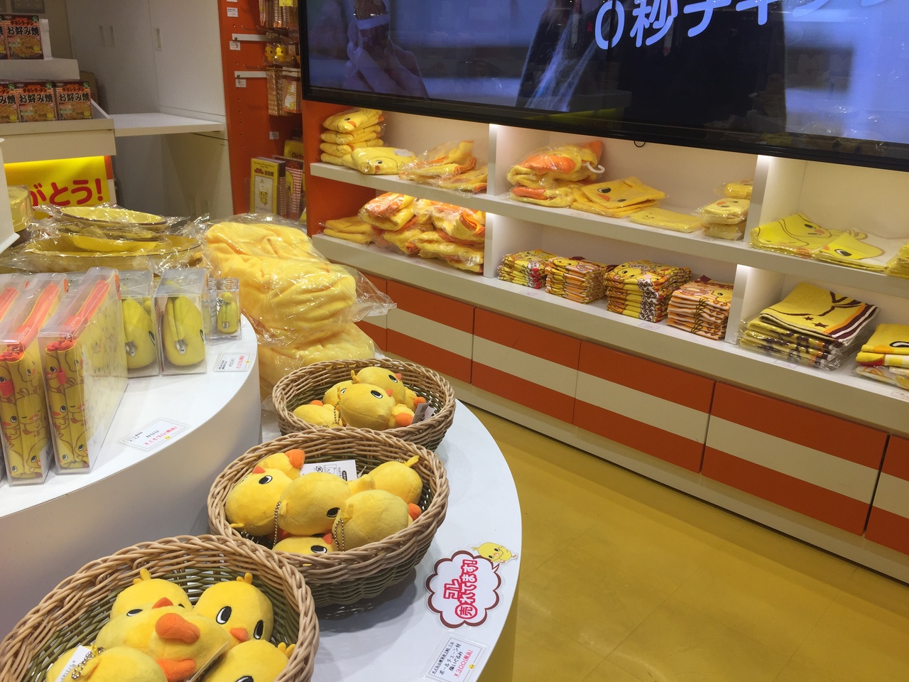 新大阪の駅の中で、小さい区画ながら黄色で目をひくショップ。なんとあのチキンラーメンのグッズ専門店がありました!