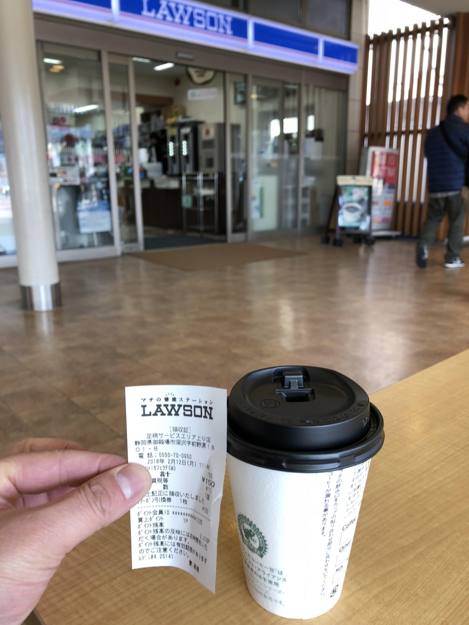 静岡にツーリングした帰りに足柄サービスエリアのローソンで無料のチケットでコーヒーをいただきました。駐車場はとても広く、トイレも綺麗、お土産物は本当にたくさんありコーヒーを飲みながら試食して十分楽しめます。