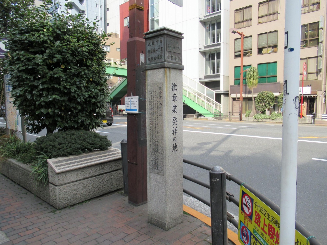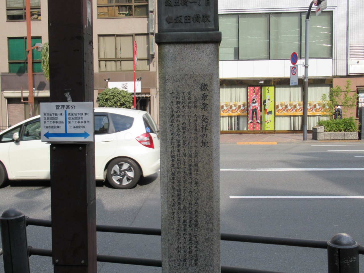その一つがここ「徽章業発祥の地」で、九段下交差点から左手 (西側) 歩道をJR飯田橋駅 (北) 方向に5分位進んだ東京大神宮への大神宮通り出入口角の目白通りの車道側に標柱が建ててあります。