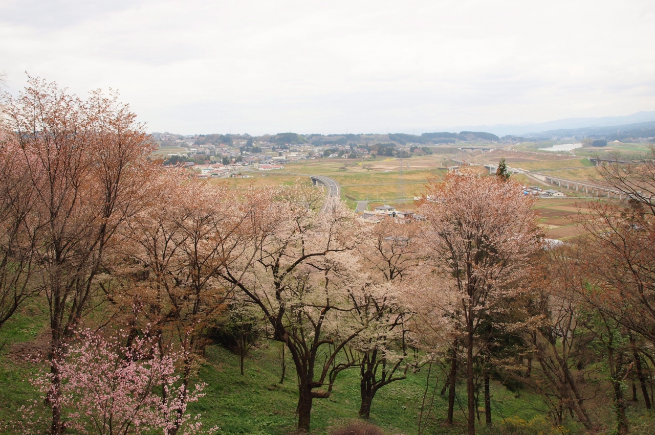 急な登りなので休み休み。途中、開けたところから桜の花の向うに北上川を望むことが出来ました。
