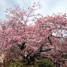 2/28時点では川沿いの河津桜は七分咲きでしたが、川沿いから看板をたよりに徒歩5分ほど路地を歩いて行くと、満開の大きな河津桜が見事でした。写真をとるなら、道路を渡って撮った方がよいです。向かい側に休憩所もあります。