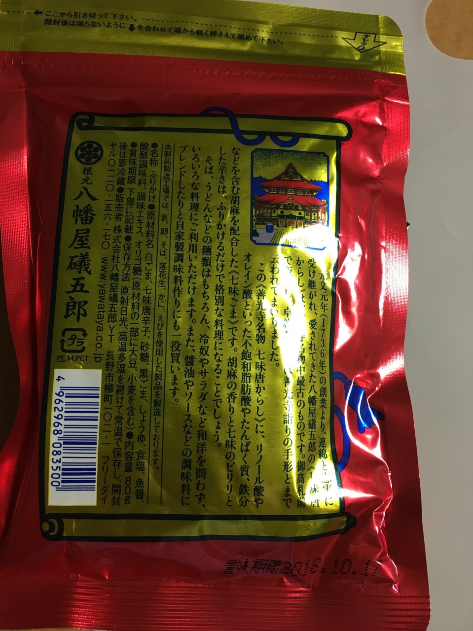 長野県のお土産に自宅用に購入しました。七味ごまの袋入り 80グラム1袋を購入。1,000円ほどなのでお土産にちょうど良いです。唐辛子の成分に由来した成分が配合されているハンドクリームやリップクリームが販売されていて気になりました。