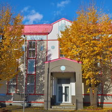 蚕都上田館の前には2本の大きな胃腸が黄色く色づき、建物の赤、白、銀杏の黄色、青い空の赤白黄青のコントラストがとても見事でした。