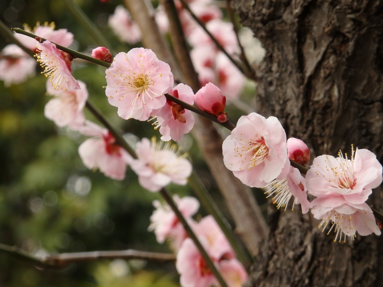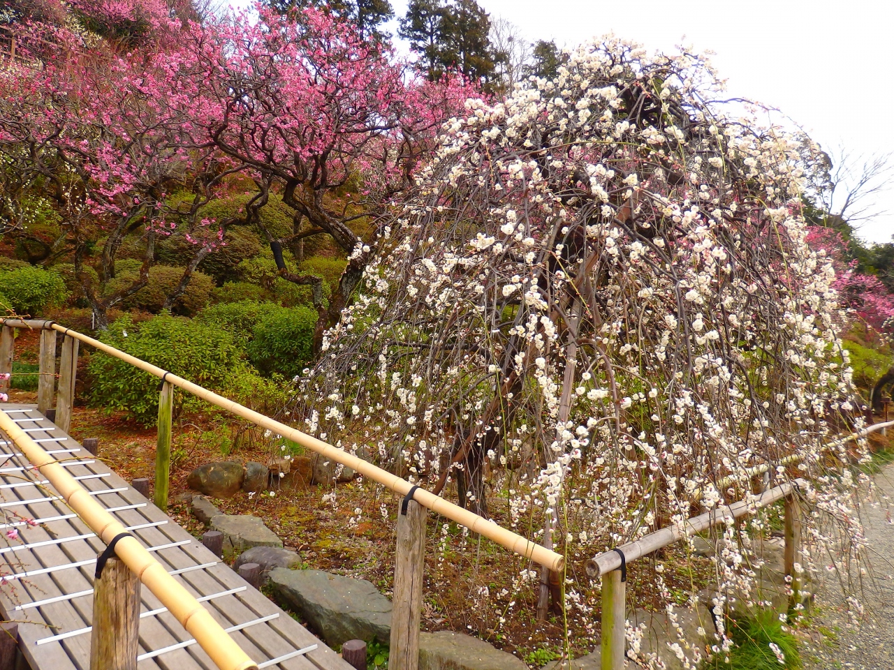 訪れた2/28現在で7分咲き。綺麗な梅を見ることができましたが、膨らんだ蕾がたくさんあったので、満開になればさらに良さそうに思えました。梅の大部分は丘の斜面を利用して植えられているので、階段の途中から眺めると赤と白の入り混じった全体の様子が眺められて壮観でした。