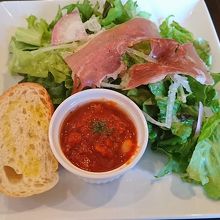 宇都宮市郊外にあるイタリアンレストランで、JR宇都宮駅から車で20分ぐらいです。こちらのレストランは、自家農園や地元の提携農園から仕入れた有機野菜などを使用しています。サラダは野菜が高いこの時期でも、新鮮な野菜がたっぷりでおいしく頂きました。