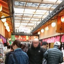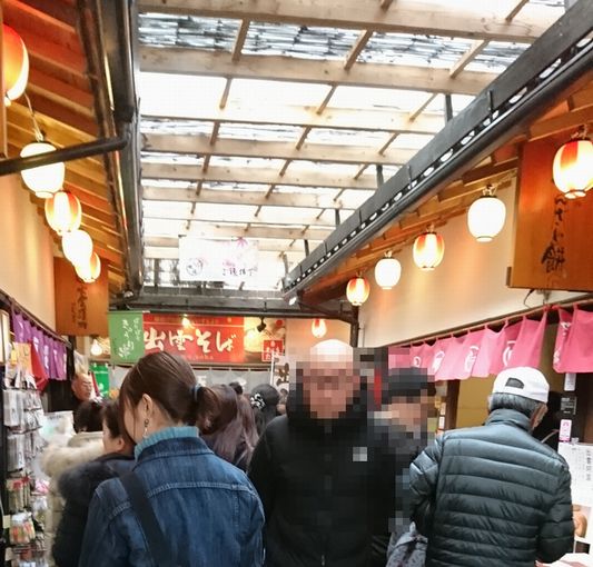 出雲大社の勢溜の正面鳥居まえにあります。ぜんざい餅や漬物、から揚げやアクセサリーなど狭いですが、多種多様の店舗が軒を連ねていました。狭い通路を行きかう人でかなりの賑わいようでした。こちらの横丁は屋根もありますので、雨の時は助かりますね。