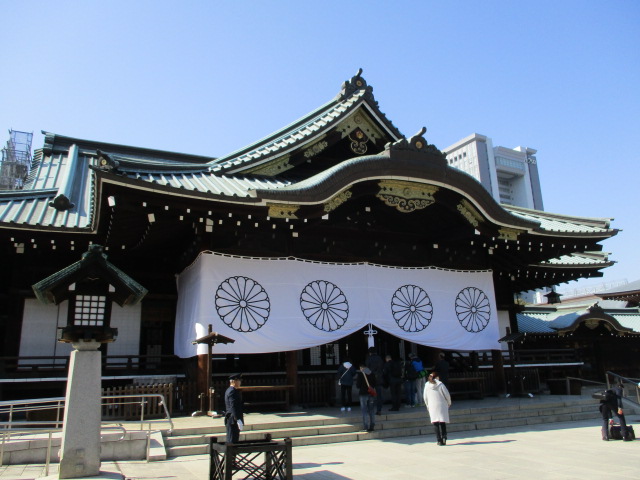 東京メトロ半蔵門線九段下駅から靖国通りを市ヶ谷方面に歩いて靖国神社の第一鳥居をくぐり長い参道進み第二鳥居、豪華な菊御紋章の神門くぐると靖国神社拝殿に歩いて10分ぐらいで着きます。拝殿で国家のために命を捧げた人々の御霊を慰め、悲しい戦争の上に今の平和があると再確認しながら平和への思いを新たに参拝しました。静かな境内で平和を維持していくことについて思考する他の神社とは違う特別な空気を感じる貴重な場所です。