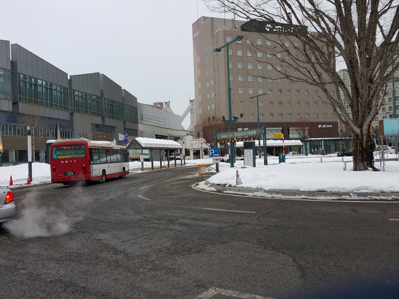 市街の路線バスの乗り場には屋根も付いているのですが、今回利用した十勝川温泉への路線バス(札幌行きのポテトライナーもここ)乗り場、乗る人(便数)が少ないためか屋根なし。