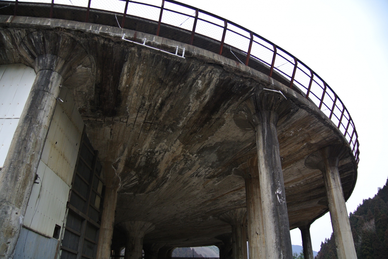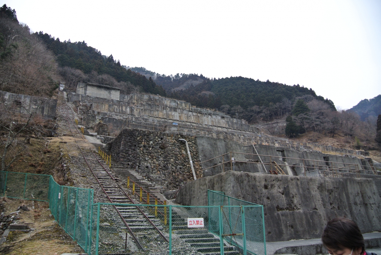 山の斜面に広がるその壮大なスケールには圧倒されます。急な斜面に残るケーブルカーのレールや鉱石を運んだ電車のレールが今も残っています。操業を終えたのは昭和62年とういことですから、30年前までは動いていたんですね。そんなに大昔のことではないのに、建物が撤去されて基盤しか残っていないので遺産感がすごく強いです。