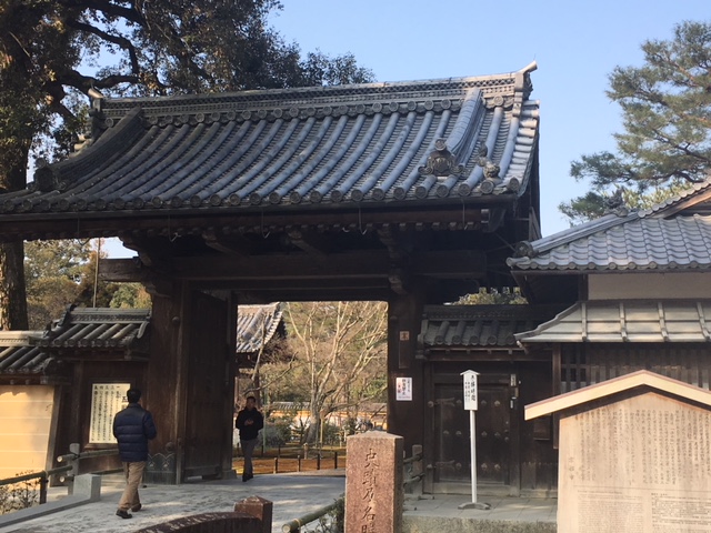 京都駅から市バスに乗って、40分かかって到着しました。バス停から1本中に入って行くと。このもんがありました。門の右手前には、大きな石に世界遺産と書かれています。ここで入場料を払って中に入りますが、入場券としてお札をくれるのは、ここだけではないでしょうか。