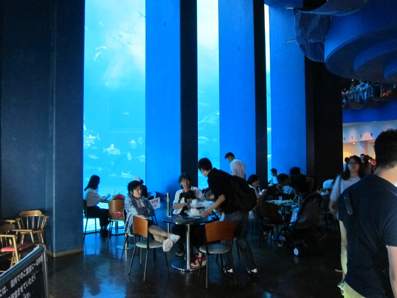 ジンベイザメの側にあるカフェで、水槽にかぶりつきの席は予約制で、30分が制限時間です。受け付けて名前を書くと、日本人は苗字で呼ばれ、外国人は番号札を渡していました。かなり待つかと思ったら、途中で断念する人や、呼ばれた時にいなかったりで20分ぐらいで呼ばれました。