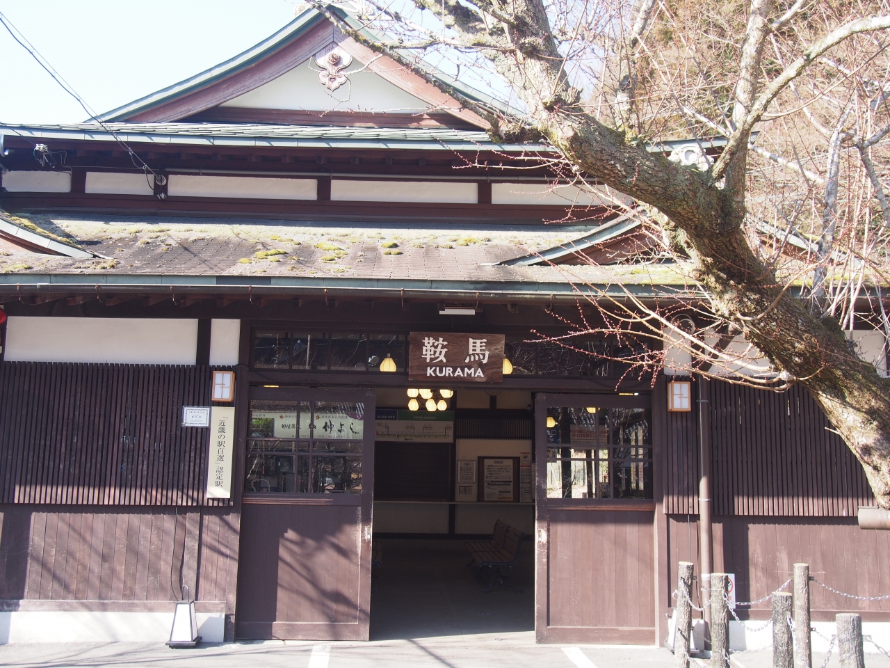 鞍馬駅は叡山電車(叡電)の終着駅です。出発の出町柳から20分ほどです。鞍馬駅付近は坂をどんどん上る感じで、奥深い山あいに上ってきたという感じがします。鞍馬駅の駅舎は屋根のある和風建築の建物で、周囲の山の中の景観に似合っています。駅舎を出ると広場には大きな赤い天狗の像があり、鞍馬へと出迎えてくれるような感じもします。