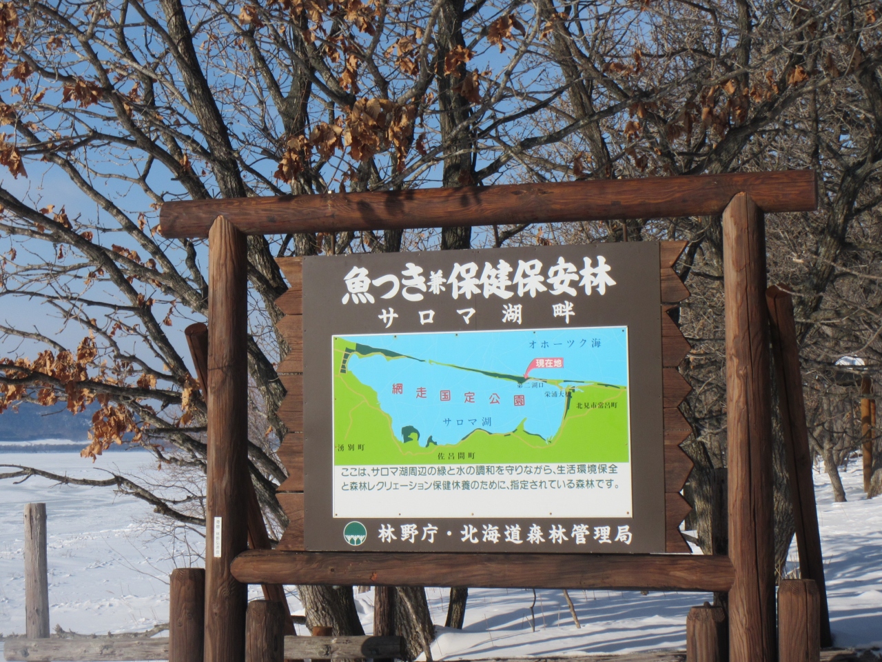 一方、常呂側ですが、第二湖口を渡った先のワッカの泉のところまでは道路があるものの、そもそも車は、根本のワッカネイチャーセンターのところで自然保護のため乗り入れ禁止になっています(ゲートが閉まっている)。