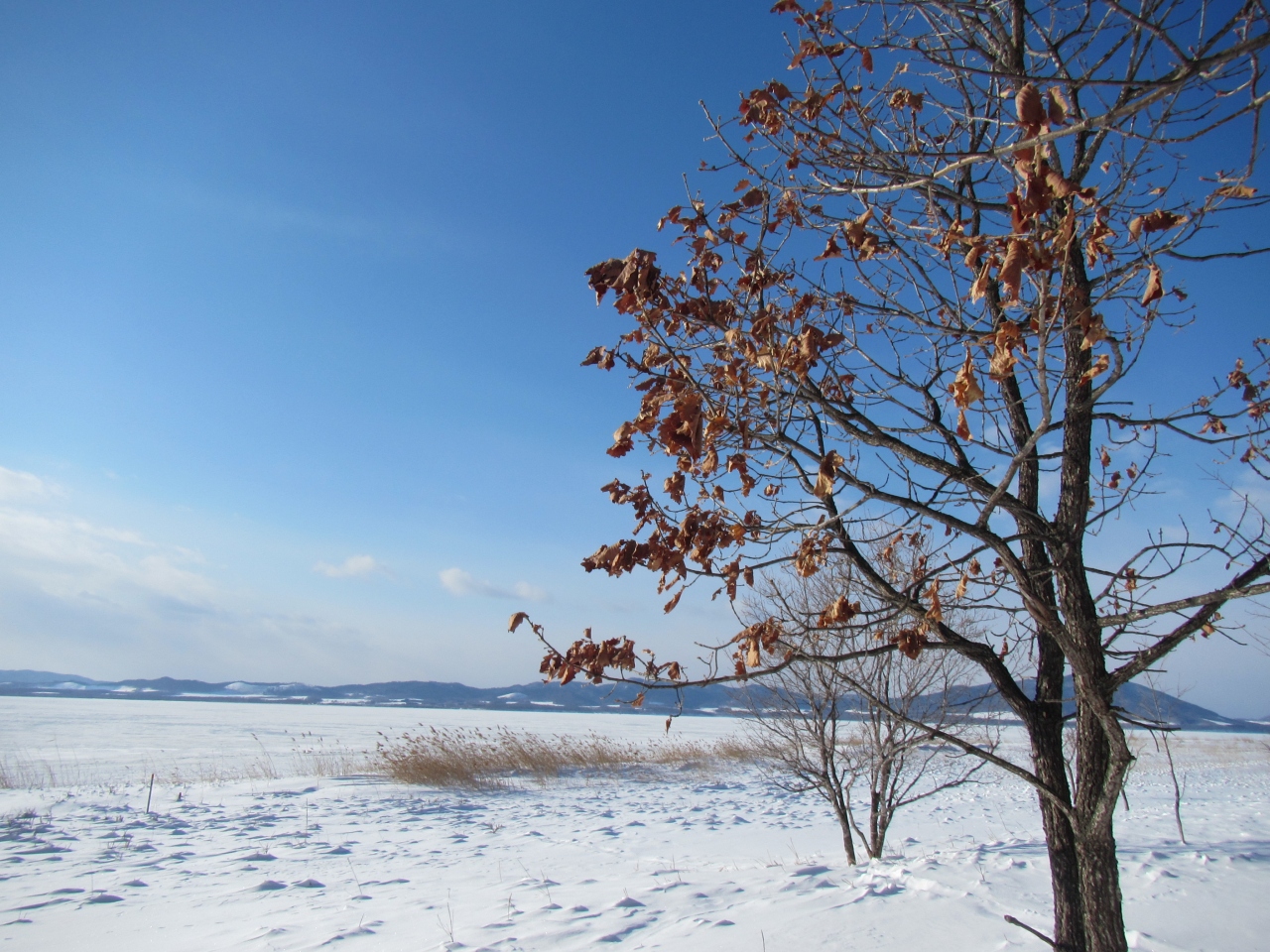 サロマ湖側も岸はそうですが、湖上に出てしまうと、少し雪をまぶしたスケートリンクのようになっていて、スノーブーツ程度で歩けてしまいます。