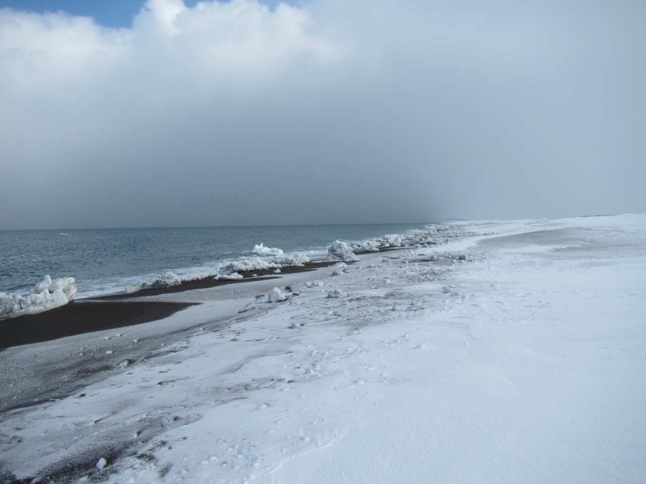 流氷が押し寄せていると、波がたたないため、波打ち際まで深雪が積もり、浜は歩きにくくなっています。