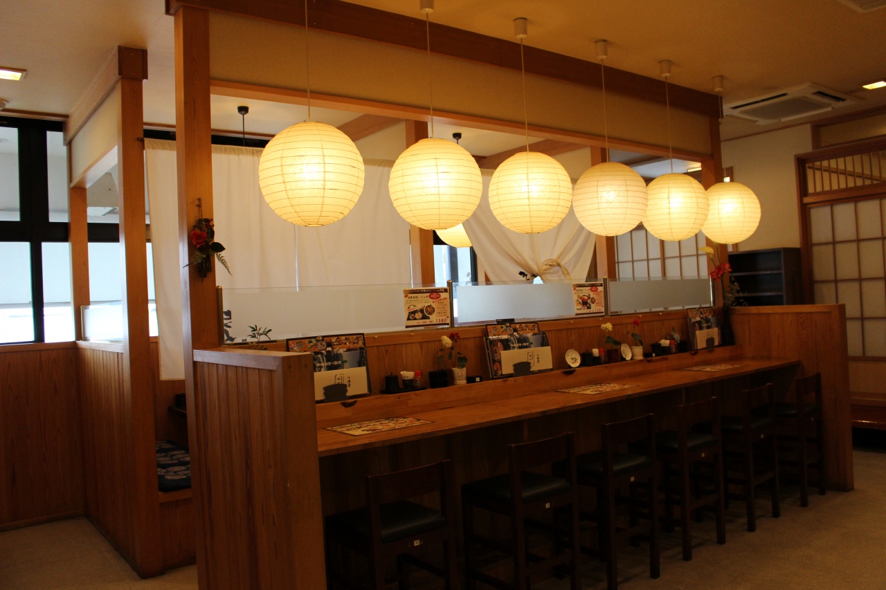 店に入ると手前にカウンター席~テーブル席と続き、奥には大小宴会が出来る和室もありました。