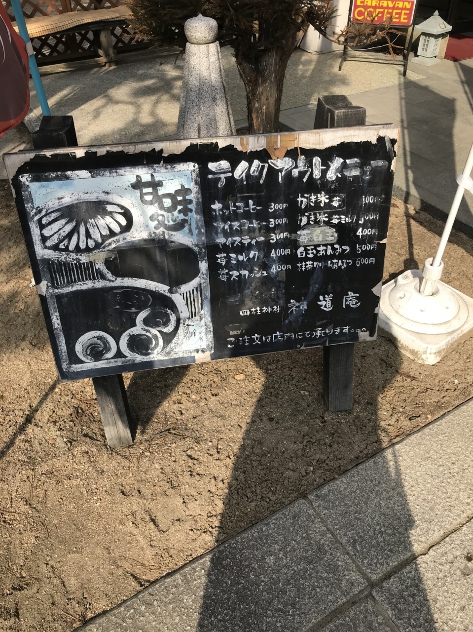 松本市四柱神社は縁結びの神様を祀っているのが有名でたくさんの方々が参拝に来ますが、四柱神社の境内にある甘味度であります。コーヒーやアイスコーヒーが300円です。おすすめは抹茶クリームあんみつが600円です。
