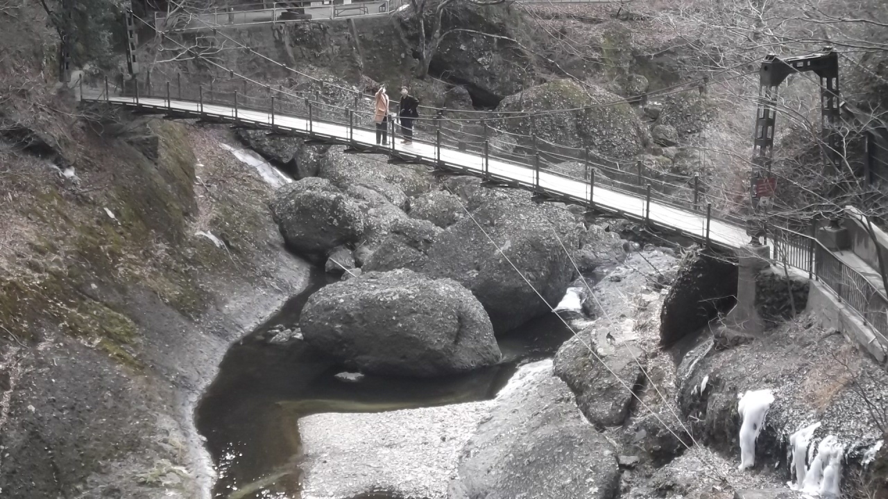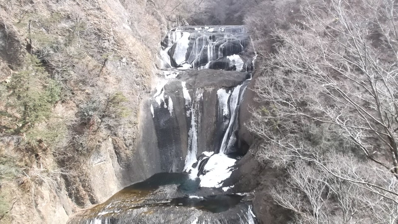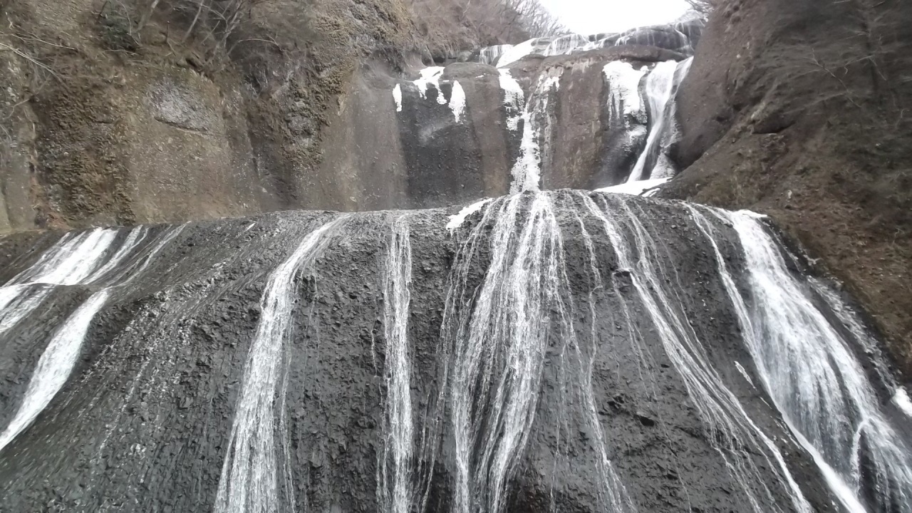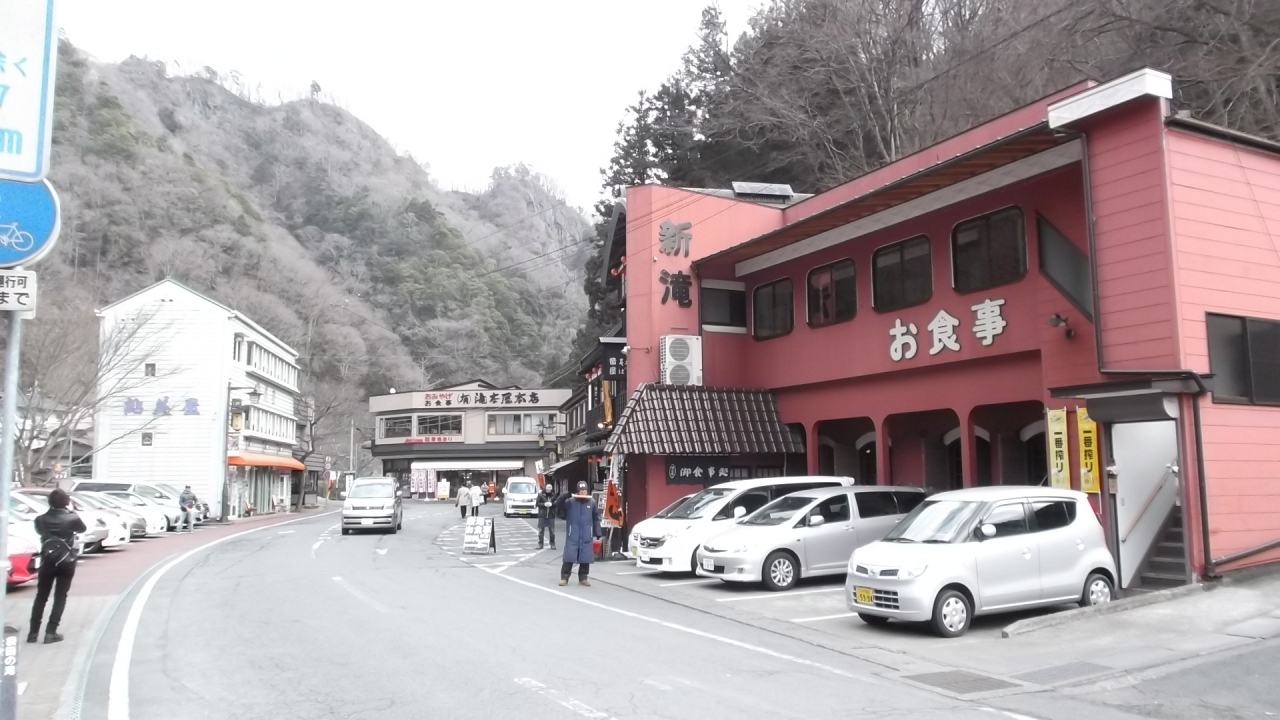 列車が『袋田駅』に着くと路線バスが待っていてすぐに発車。終着の滝本まで10分かからない(運賃210円)。バス停から徒歩15分程度で到着。沿道には土産物店があり少し賑わいを見せていた。凍結した滝を楽しみにしていましたが、生憎滝は流れていた。
