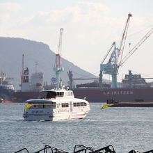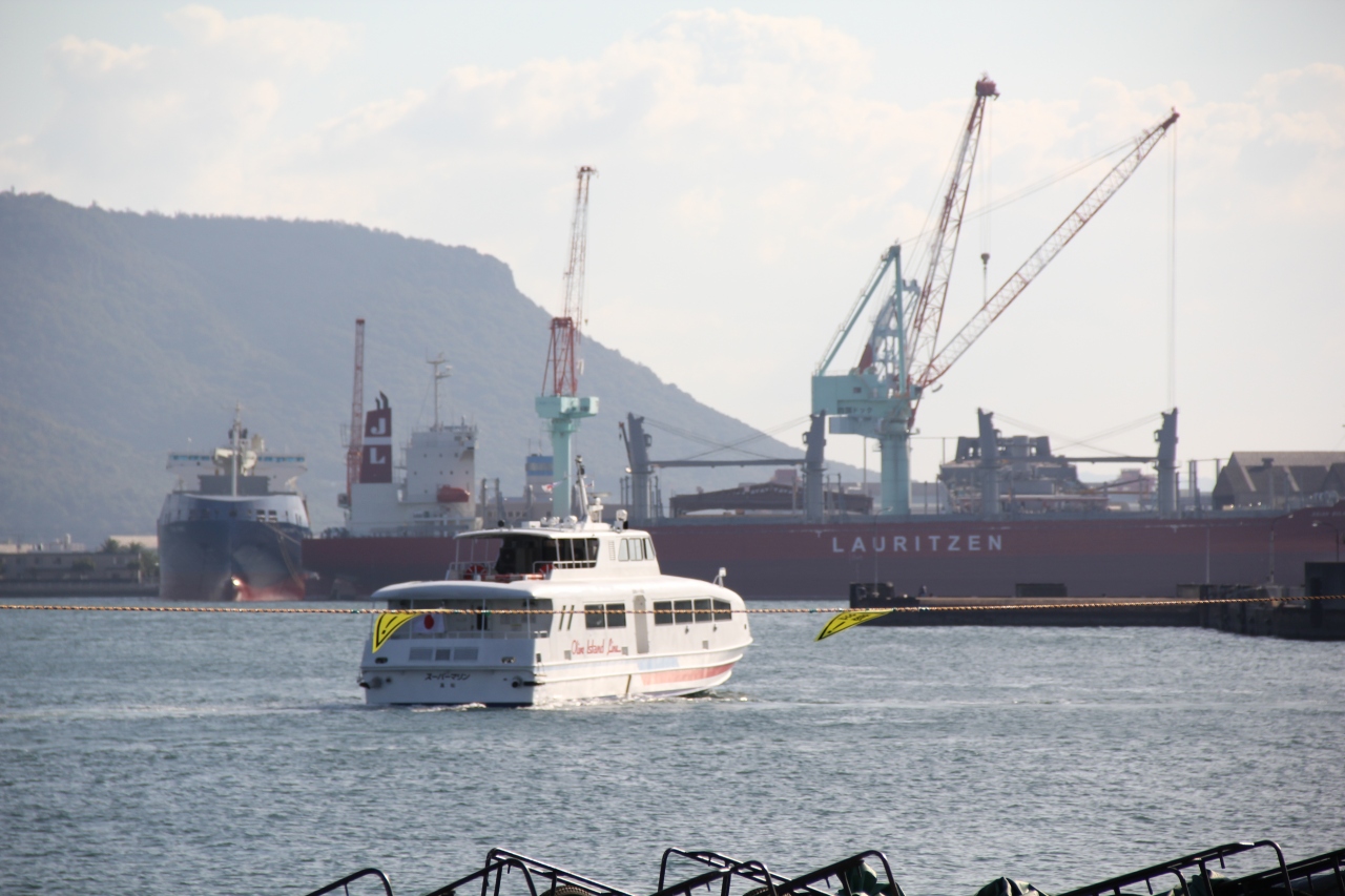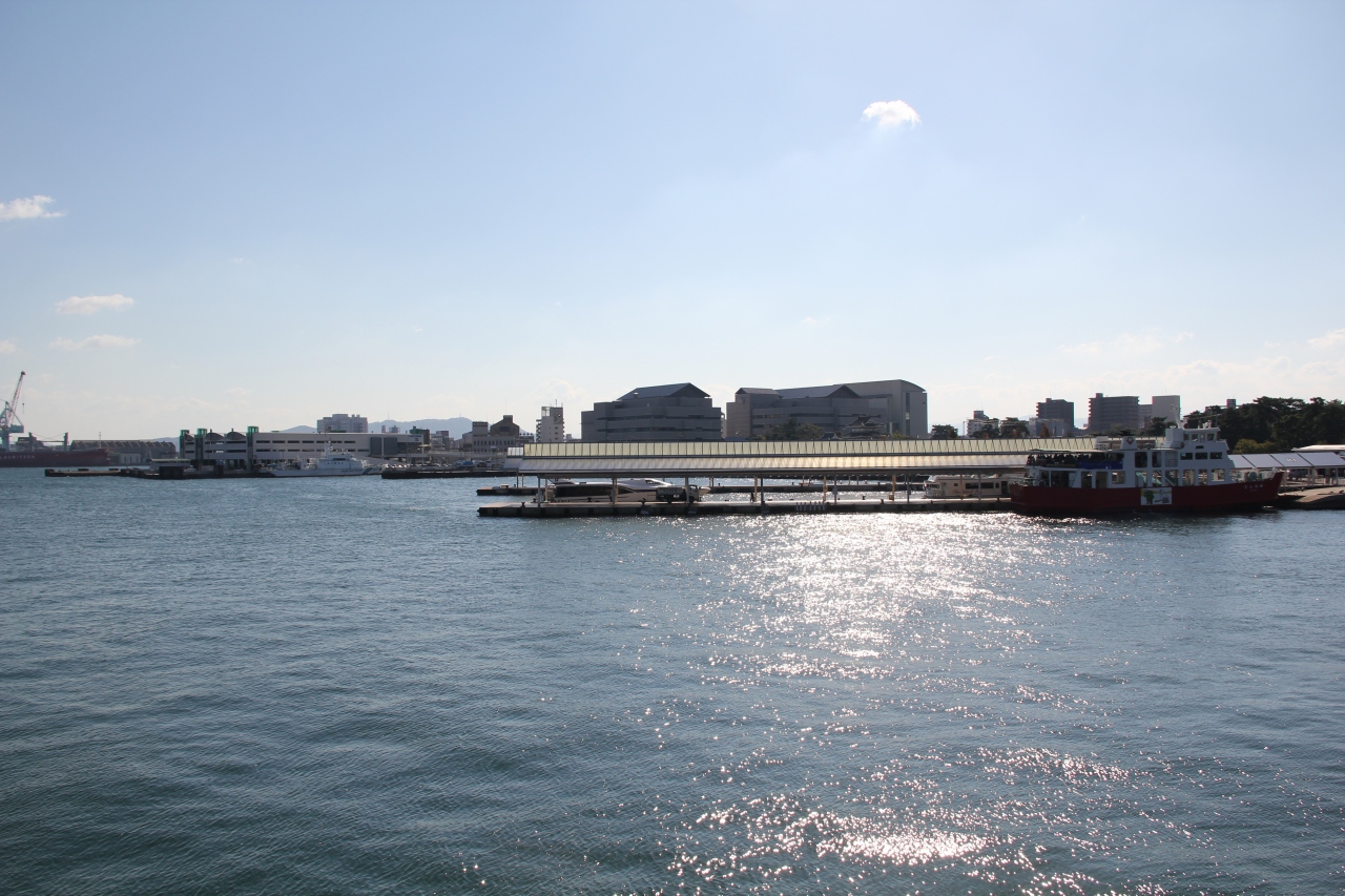 この港から小豆島、直島などへのフェリーを利用しました。潮風が気持ちよくていい港です。この港の周りには高層ビルが立ち並んでいて、発展している港ですね。赤い綺麗な灯台があって、夕日に染まった姿は絵のようですね。