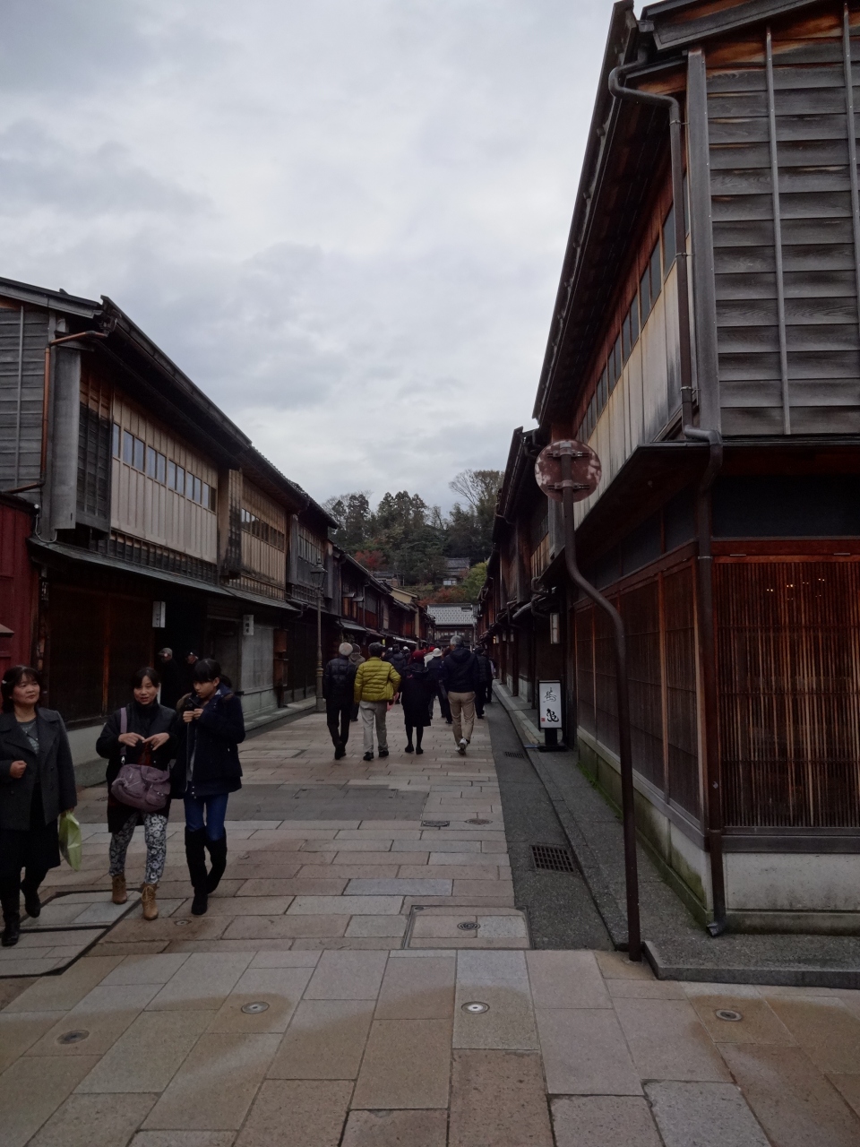主計町の風情を楽しみながら、浅野川に架かる「中の橋」を渡り右に進むと、有名観光スポット「ひがし茶屋街」に。金箔、加賀友禅などの工芸品のお土産屋や、お抹茶や和菓子を味わえるお休処などがあり、その中の「中田屋」で、きんつばセットと善哉セットを味わい窓から通りを暫し眺め、その後ひがし茶屋街界隈を散策。