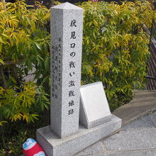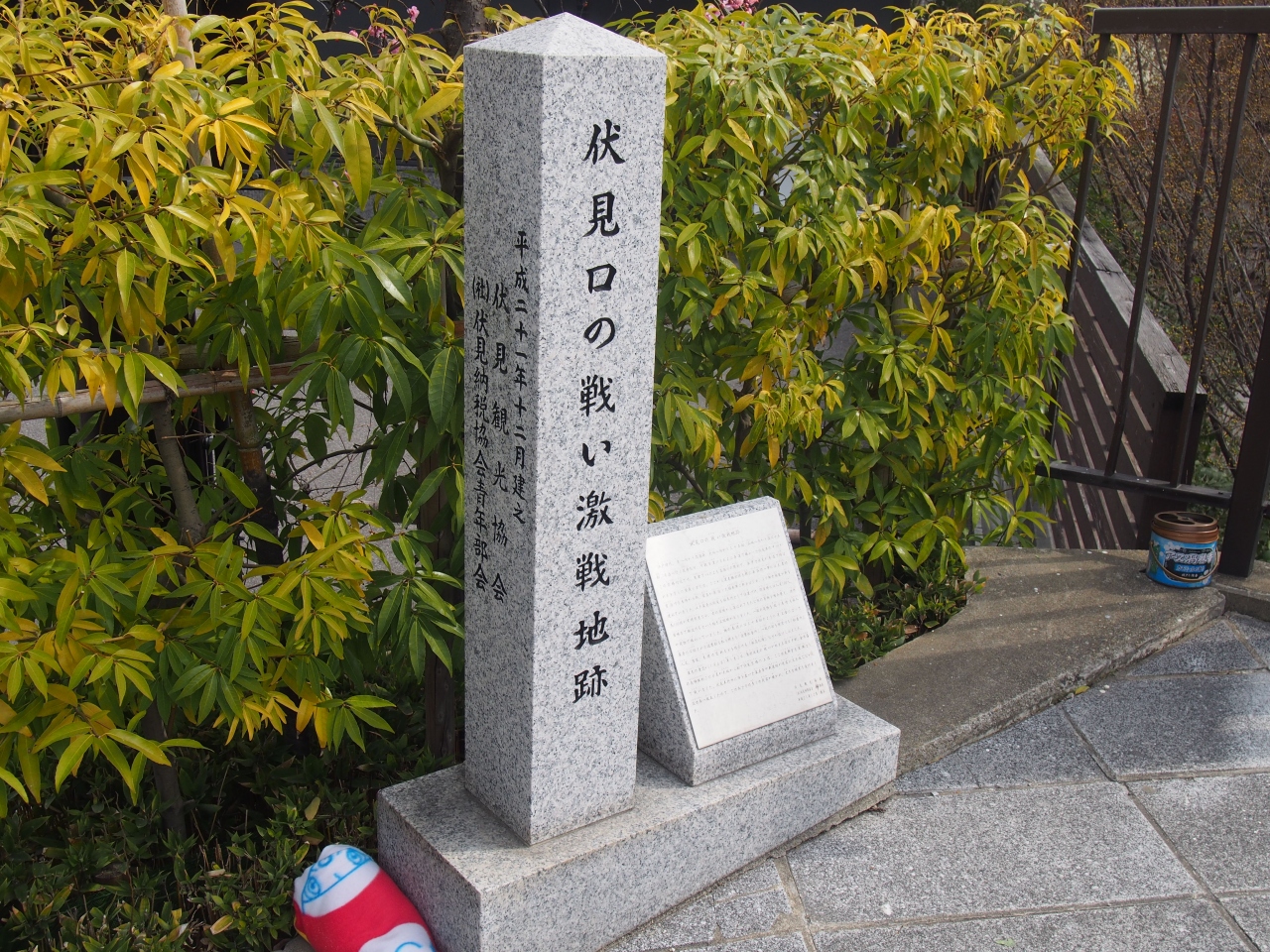 竹田街道の京橋の北側に伏見口の戦いの激戦地の碑が建っています。小さな碑と説明板があるのみです。鳥羽伏見の戦いと呼ばれる、明治維新すぐのときの薩長連合軍と会津藩、幕府軍などの戦いです。戦いで伏見の街は多くが焼き払われ、坂本龍馬襲撃のあった寺田屋もこのときに焼け落ちたそうです。重要な歴史の舞台であった場所がわかり、少し感慨深かったです。