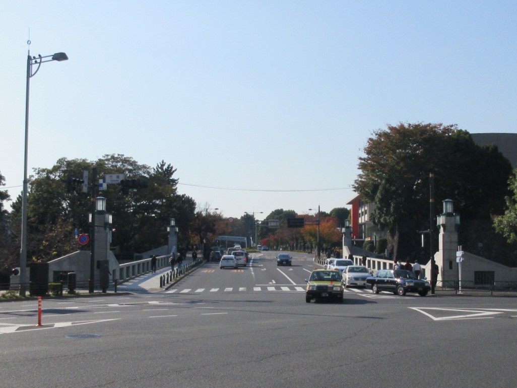 地下鉄の竹橋駅を降りてすぐの場所にあるコンクリートの橋です。関東大震災の後に架けられたとのことで、横から見るとアーチ型が美しく、渡る際には時代の雰囲気と伝える立派な親柱を楽しむことが出来ます。車の通行量も多い橋ですが、ところどころ紅葉の始まった皇居の深い森を楽しみつつ、気持ち良く散策することが出来ました。