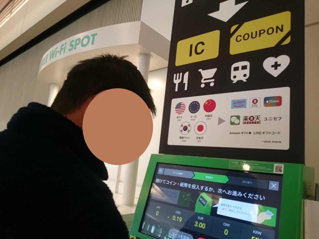ユーロ、米ドル、元、ウォンなど日本人がよく使う通貨をワオンなどの電子マネーに替えられる機械が羽田空港到着口近くにあり、今回使用しない小銭を持参しチャージしました。