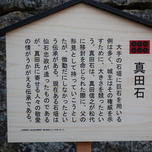 上田城の本丸入城口である東虎口の右手、北櫓の石垣に3m程の巨大な石が組まれています。この巨石が真田石です。信之が松代に移封される際に持って行こうとしてもびくともしなかったと言われる巨石です。