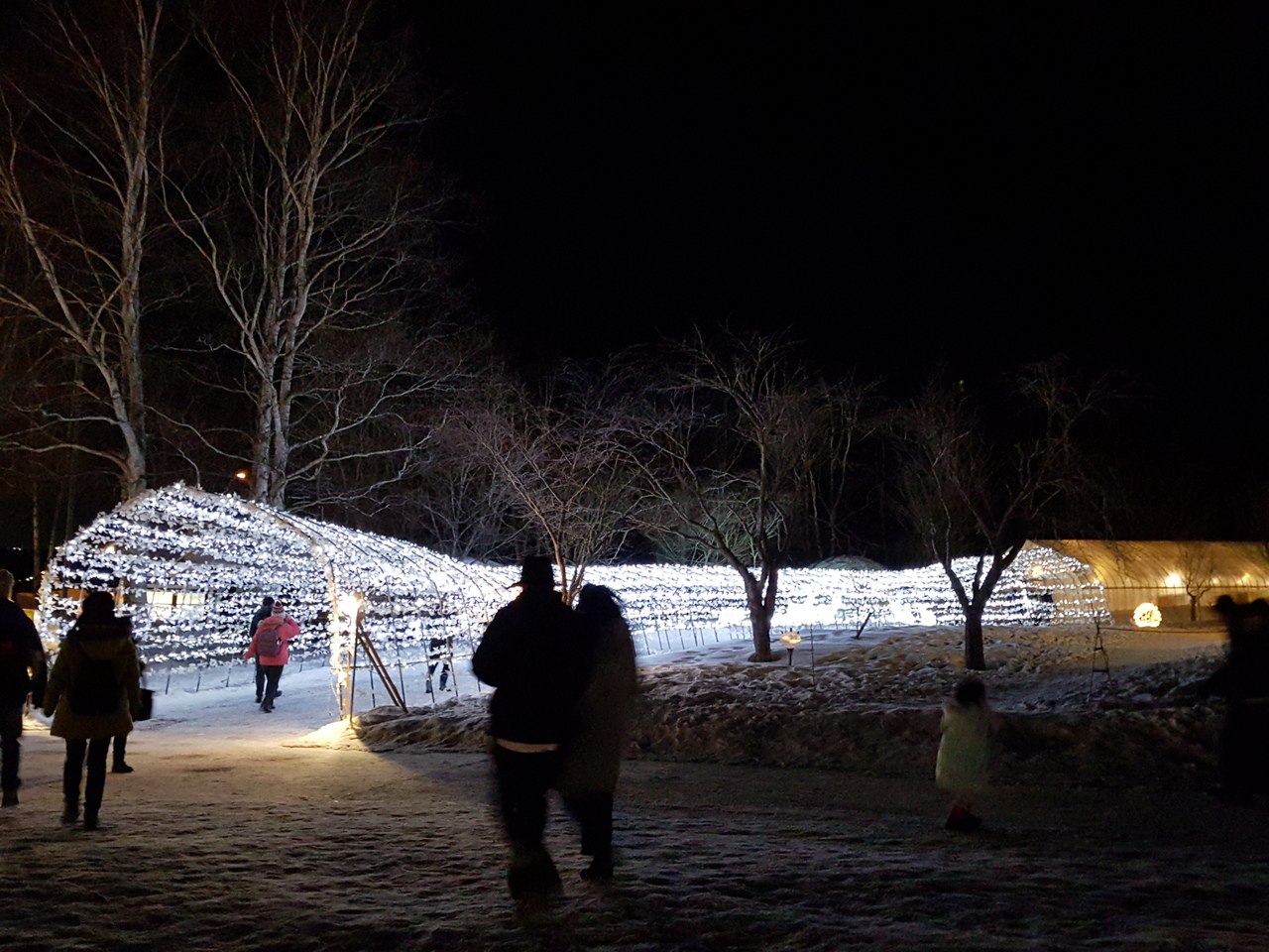 今回は雪景色のイベントへ行きましたが、大きな花時計も(もちろん花はなく雪)ライトアップされていてイベントの一部になっていてとても綺麗でした。