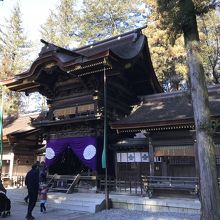 国の重要文化財の弊拝殿・ 片拝殿は立派な建造物だ。木々に囲まれた境内はひっそりとし、静寂さが尊厳さを感じ取らせてくれる。