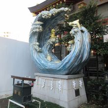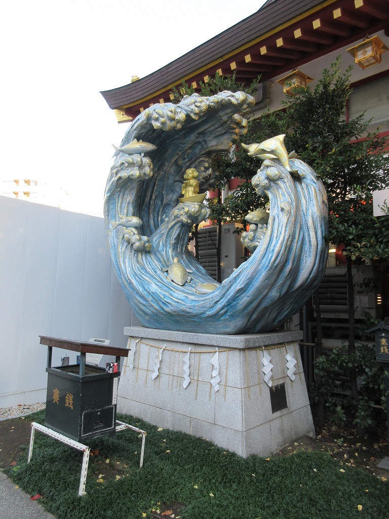神田明神の随神門を通って左手に海の大波を3Dで描いたような変わった造形のモニュメントがあり、近づいてみるとえびす様の像で驚きました。タイを釣り上げたふくよかなお顔のえびす様像は時折見かけますが、こうした青に色をしたモニュメントで表現するとは恐れ入りました。欧米人には海の神様ネプチューンの像、アニメオタクにはアニメのトリトンの像だと説明したら、疑わず信じてしまいそうな像です。