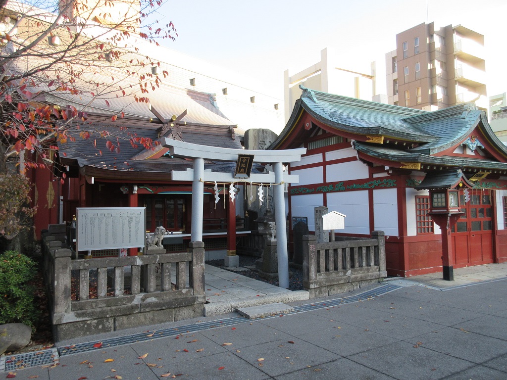 神田明神の境内、本殿から裏手に進むといくつもの末社が立ち並ぶ一角があります。何柱もの神様が合祀されていて、旧・籠祖神社の社地に建立されたとのこと。富士神社や諏訪神社、八幡神社など、日本人であればどこかで名前を聞いたような神様はここ神田明神で参拝できるようになっています。建物は比較的新しく、敷地も狭いながらも狛犬など一通りの神社らしい要素はそろっていました。