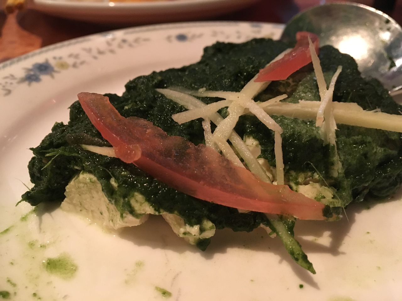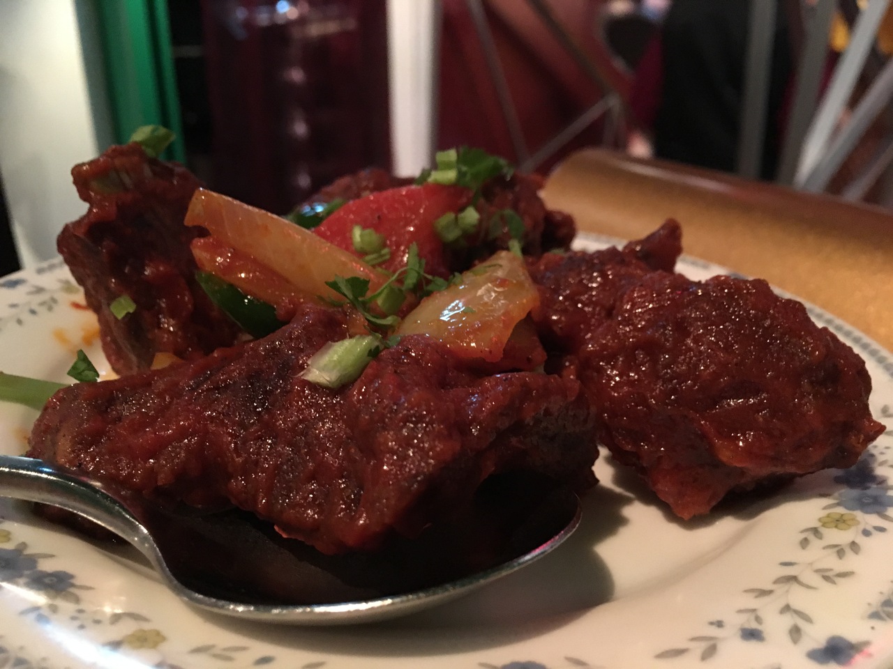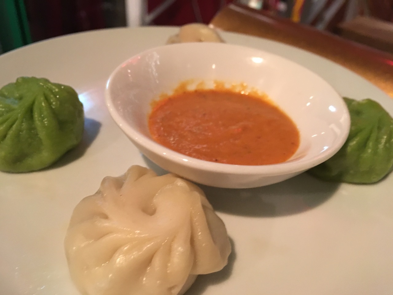 鍋の前に出てきたのは、豆腐にホウレン草のペーストを乗せたモノ・豆腐パルンゴ、ネパール小籠包・モモコ、スペアリブのチリソース。どれも一口運んで「おっ!これは!」となる美味しさ。特に、豆腐パルンゴのほうれん草ペーストは絶品。スペアリブのピリ辛加減も大変によろしい。