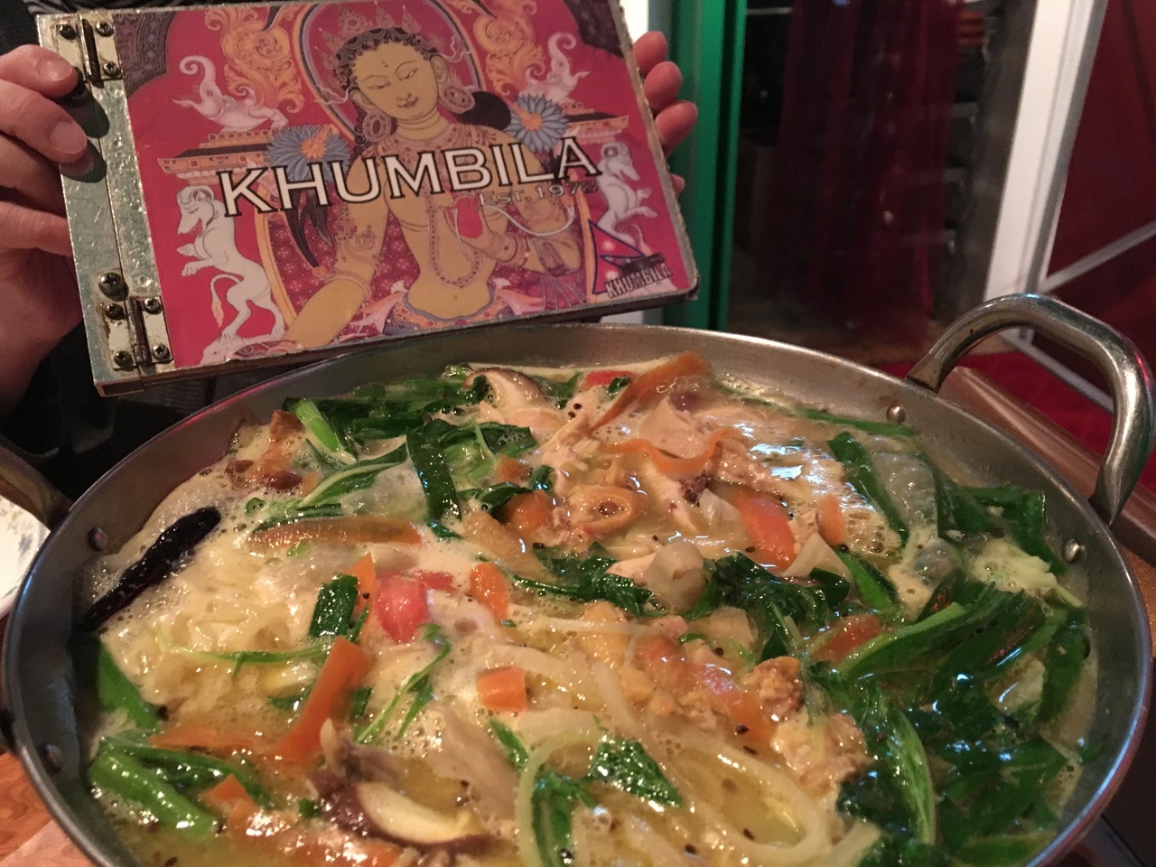 ヒマラヤ鍋は、鍋の具となる鶏の塊からその場で骨を抜いて身をほぐすお店の人の箸さばき(厳密には箸ではないけど)も見もの。野菜たっぷり、スパイスしっかり、鶏肉たっぷりの鍋は、岩塩やパクチーなどの薬味も付いてモリモリ食べられる。おかわり自由だったので、我らは野菜のみお代わり。お腹が膨れるのを忘れる勢いで箸が進んでしまう危険。