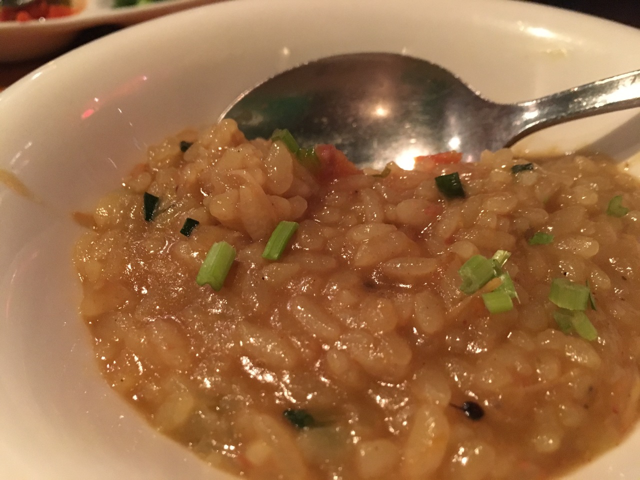 さて、出汁がしっかり取れてスパイスも効いてるスープは、締めにうどんorお粥を選べる。スープとの絡みを考えればお粥かな?と思って注文。私達は勝手にサラサラお粥をイメージしていたのだが、なんとお店の人はお米がしっかりスープを吸い込むまで煮込み、更に岩塩も追加してかなりしっかり味のお粥を作ってくれた。私の好みで言えば、正直ちょっと味が濃すぎたお粥だが、それでも文句なしに美味い。当たり前に、美味い。