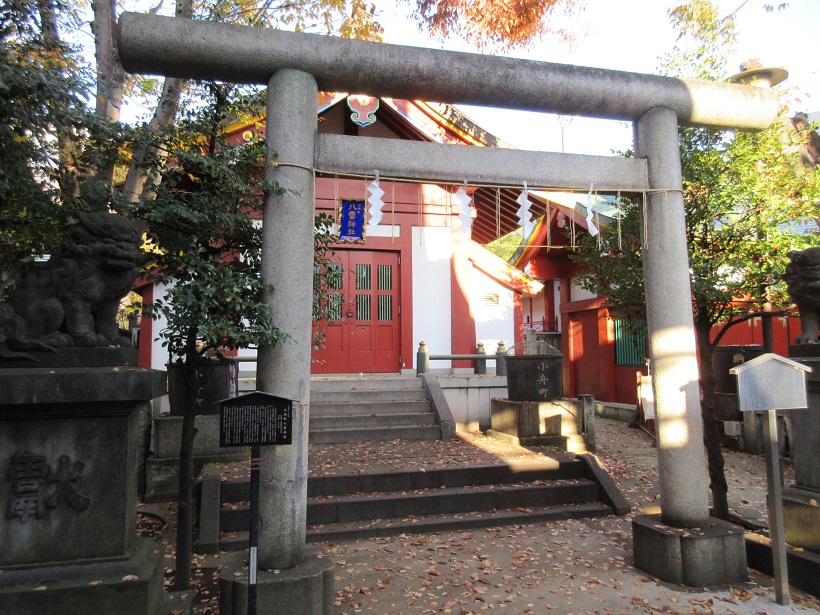 神田明神の本殿から裏手に回ると「小舟町八雲神社」がひっそりとたたずんでいました。小舟町というのは寄進したのが小舟町の方たちであったころから来た名前とのこと。こちらの社殿には御神輿が奉納されているようですが、旅行で訪れた私にとっては紫がかった八雲神社と書かれた扁額の色の方が印象にのこりました。