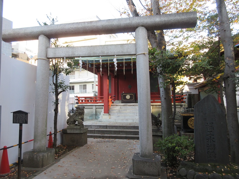 神田明神の本殿から裏手に回りこむと、末社が並ぶ一角があり、その中の一つが魚河岸水神社でした。嘗て日本橋に魚市場があったことから、漁の安全を祈願して建立したことが始まりとのこと。私が訪問した時には丁度横で工事が行われていて白い仮囲いが左手に設置されていましたが、参拝には支障はなく、他では見かけないお社を見学できました。