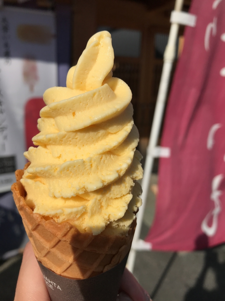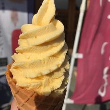 でも私の目当てはサツマイモのソフトクリームです。紫芋のソフトクリームも好きですが、このサツマイモのソフトクリームは焼き芋のソフトクリームと言った感じでしょうか。中にはサツマイモのツブツブも入ってます。