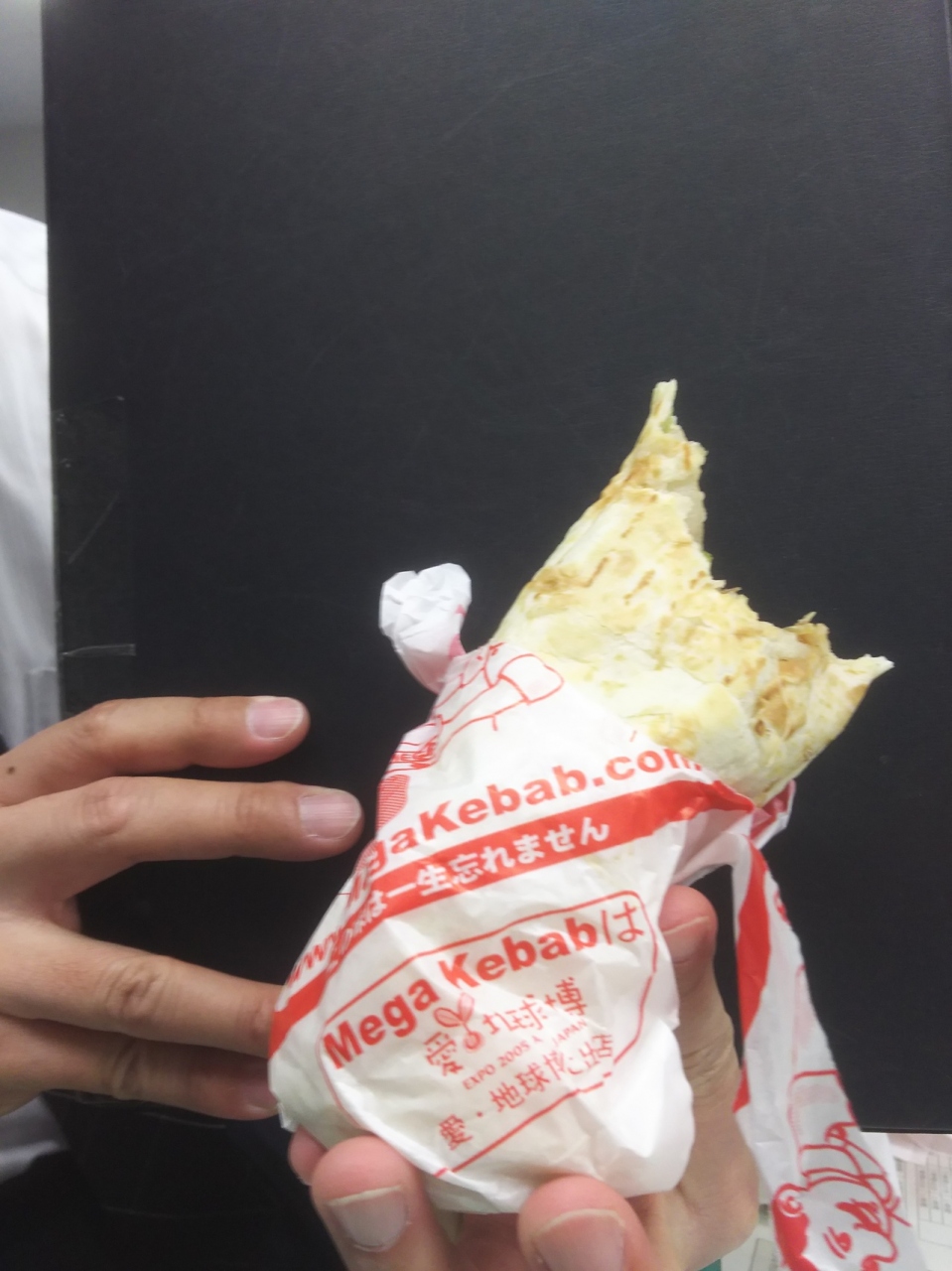 中部国際空港旅客ターミナルビル4階のフードコート内にあるメガケバブでテイクアウトしました。アップしたケバブの写真はひと口噛みついた後です。すいません。ケバブのボリュームは結構ありますが、値段も結構します。朝ごはんに丁度良い量です。